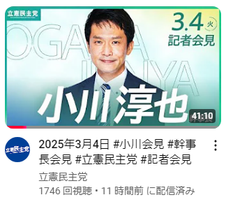 同日同時刻には立憲民主党の小川淳也幹事長の会見も行われましたが、再生数では玉木代表の100分の1という大惨事となっています。玉木代表は3か月ぶりの復帰会見ということで話題性もあったわけですが、不倫報道前から多いもので再生数が70万回に達するなど人気がありました。