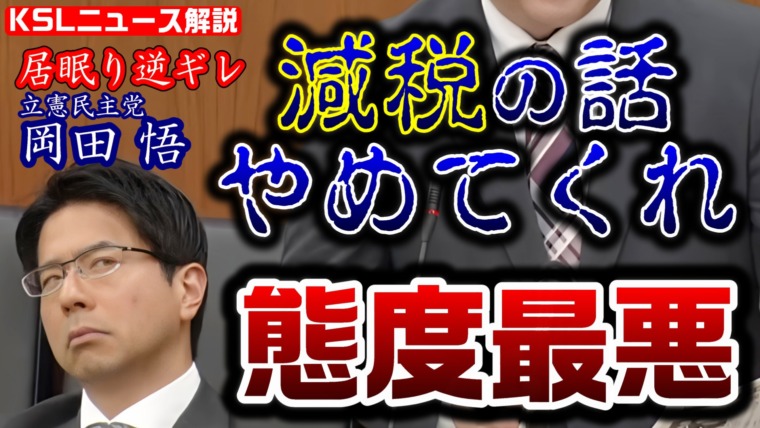 れいわ新選組の高井崇志議員の質疑中に、居眠りをしていたのではないかと指摘され逆ギレしていた立憲民主党の岡田悟議員が、今度が高い議員が減税の話をしている最中に、ブツブツと独り言を言ったり、睨みつけるような表情をして、最後は「早く終われ」とばかりに怪訝な表情で腕時計をみるという持ち前の態度の悪さを見せつけています。