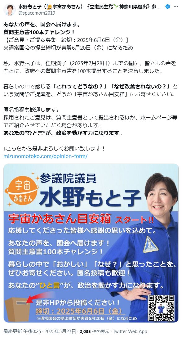 水野さんは不出馬によって今季限りで国会を去るわけですが、なんと官僚の業務負担が大きいとされる質問主意書をこれから募集し、会期末のわずか2週間で100本以上提出する計画をぶち上げました。パワハラ報道で出馬辞退するのに、去り際の最後っ屁のように官僚をいじめちゃダメでしょう。