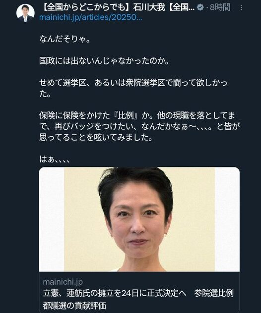 石川大我さんと言えば先の動画でも解説しましたが、立憲の全国比例に蓮舫さんが割り込んできたことで、当選圏外に押し出される可能性が最も高いと言われている現職です。詳しくは前回動画を視聴してほしいんですが、この石川大我さんが蓮舫さんの出馬に対してXで不満をぶちまけていました。