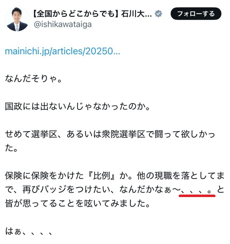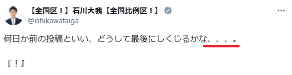 スタッフが「他の現職を落としてまで、再びバッジをつけたい、なんだかなぁ」とか投稿するわけがないと思うんですが。しかも石川議員本人が投稿したとしか思えない過去投稿と共通する癖も確認できました。これは後ほど解説したいと思います。