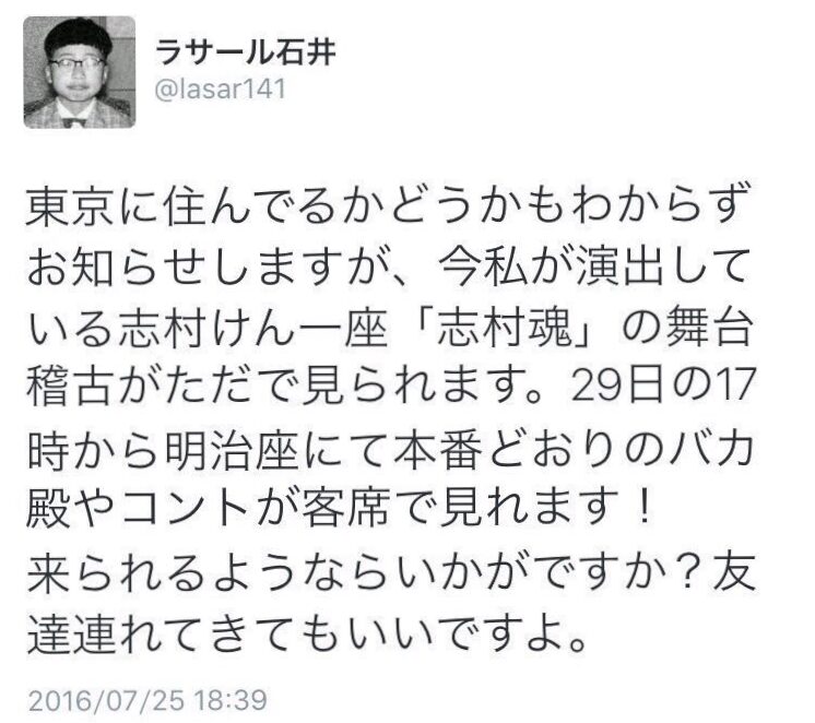 【ラサール石井・記者会見】社民党は参議院議員選挙の比例予定候補として、ラサール石井さんの公認を決定しました。明日6月30日の14時より、本人の記者会見を行います。#あなたが笑顔で暮らせる国を… pic.twitter.com/vr0RxIYLzS