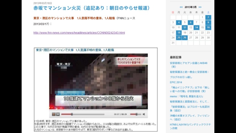 これが12年経っても繰り返し利用されているわけですが、そうなった理由にはテレビ朝日の致命的なミスが絡んでいるようです。なぜなら、火災のあった現場を俯瞰で写しながらレポートし、テレビ朝日記者の住んでいるマンションの自室と思われる場所を放送すると、当該局員の住所をテレビ朝日がセルフ開示したことになるわけです。記者の住所を晒すなど命に関わることで、この件が話題となっていることを知ったのか、テレビ朝日はすぐに動画を記者の映っていないバージョンに差し替えていたことがスレッド内でも語られています。