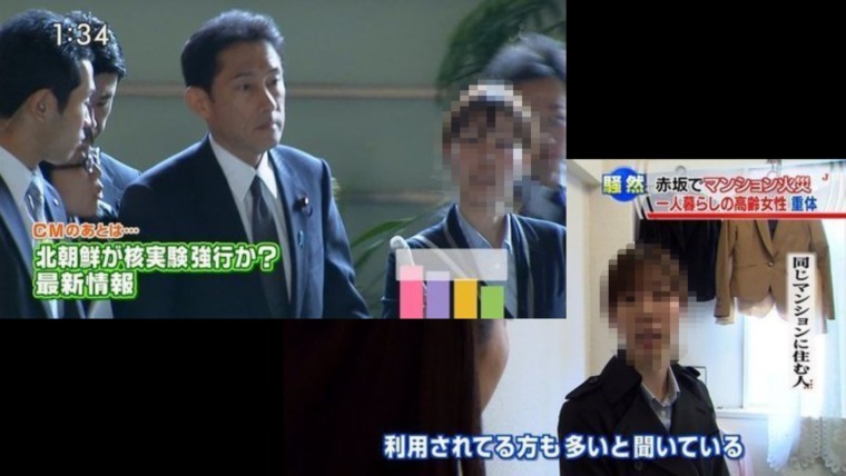 まず12年前のスクショですが、これは2013年2月の北朝鮮の核実験強行を受け官邸入りした当時の岸田文雄外務大臣にぶら下がるテレビ朝日の記者のスクショと、その翌月の2013年3月に赤坂のマンションが火災となり、高齢の女性が意識不明の重体となっているというニュース映像で、インタビューに答える女性のスクショです。この火災現場の女性は官邸でのテレビ朝日記者と同一人物で間違いありません。