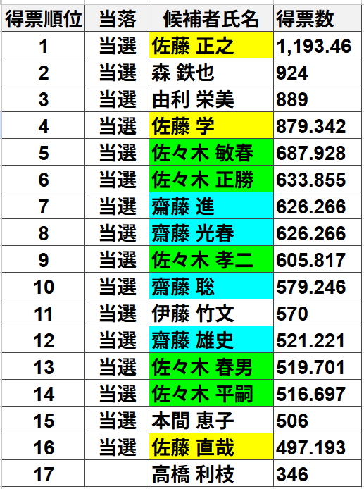 候補者17名中12名が3つの姓で被るという全国的に見ても珍しいわけですが、にかほ市では前回も前々回もずっとこの状況です。特に今回は姓の被った12名全員に按分が発生しているので尚更でしょう。